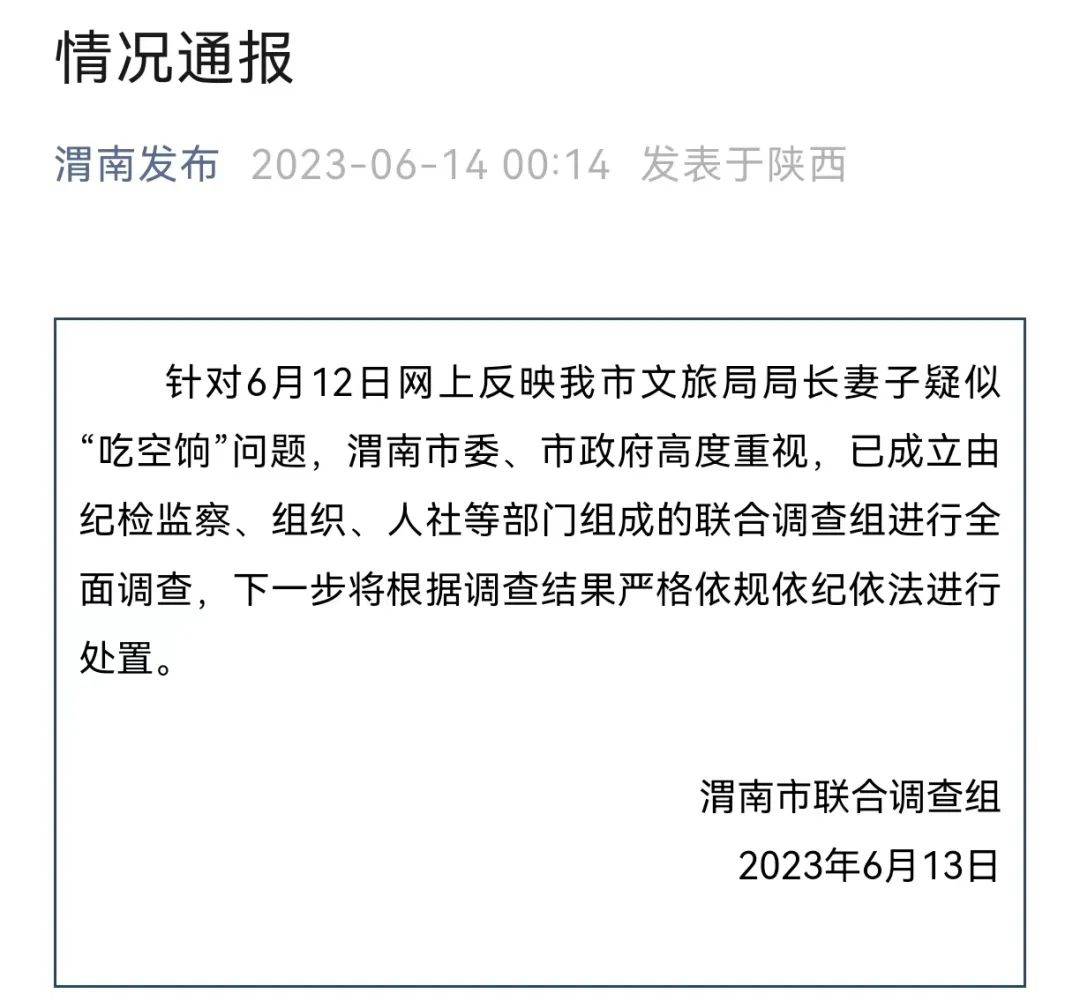 针对6月12日网上反映我市文旅局局长妻子疑似“吃空饷”问题,渭南市委、市政府高度重视,已成立由纪检监察、组织、人社等部门组成的联合调查组进行全面调查,下一步将根据调查结果严格依规依纪依法进行处置。