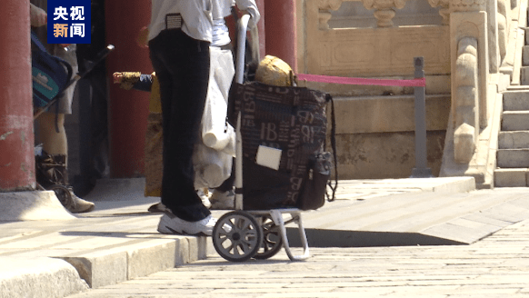 故宫博物院故宫世界遗产监测部高级工程师齐飞介绍,从遗产保护的角度上来看一切可能影响遗产安全的风险都需要在保护管理的过程中加以防范,其中对于风险源头的控制是防范的重要手段。比如说,御花园的石子路面,是传统油灰嵌石子的做法,一些大的行李箱或者是行李车的轮子碾压在上面会将小石子挤压松脱就造成地面图案的不完整或缺失,还比如一些超长或者超大的设备或用具在通过墙门过道的时候,它就非常容易剐蹭到墙体或者琉璃件,这样就会造成构件的脱落或者残缺,因此这些设备都是禁止携带的。