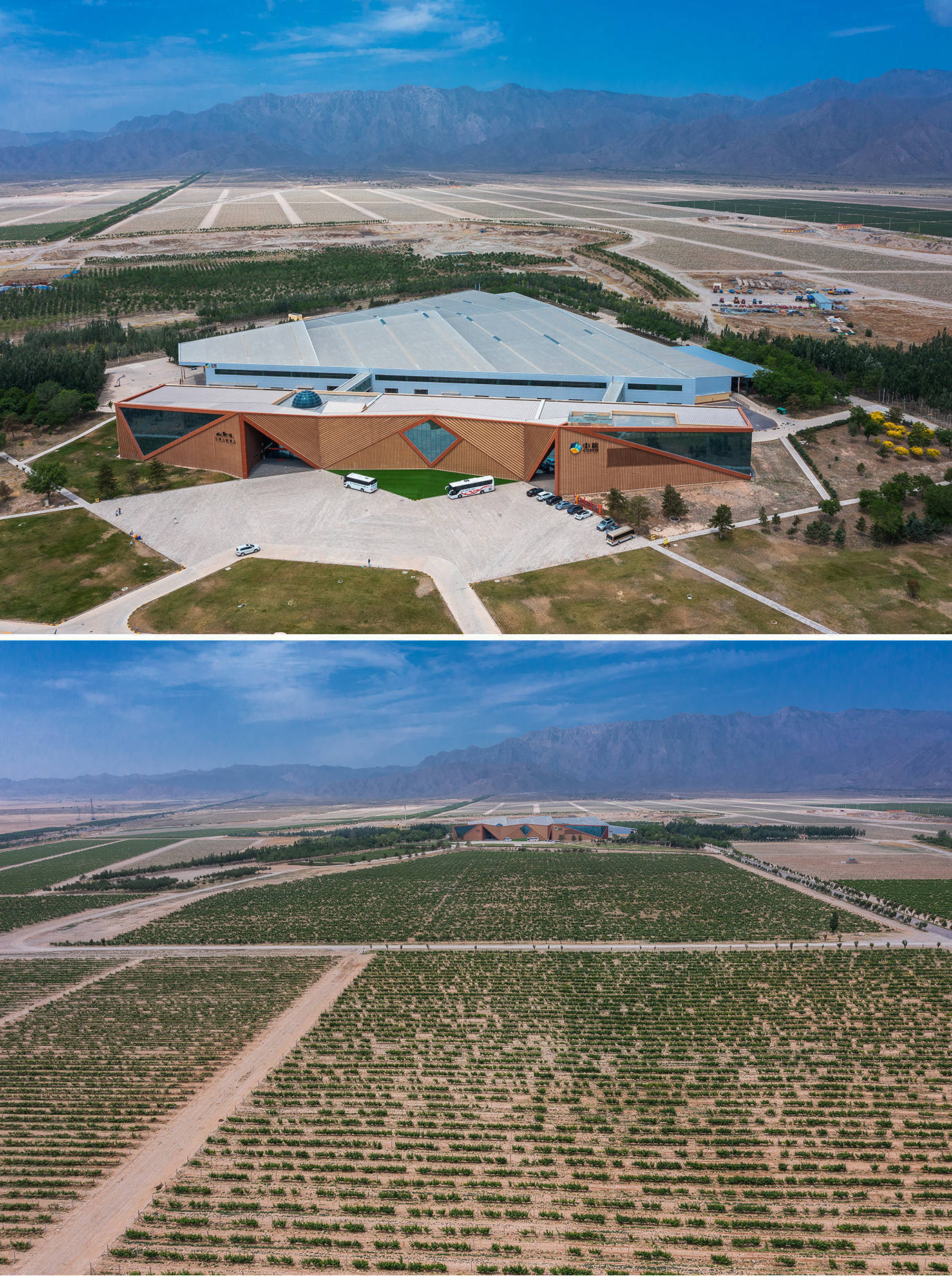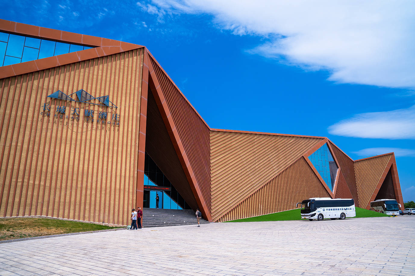在茫茫荒漠中,长城天赋酒庄的外观格分外亮眼。由意大利设计师精心打造,以贺兰山为灵感,加入了黄河、长城、葡萄酒等元素,现代风格的建筑主体按贺兰山脉走势设计,曲折的大块立面分割,营造强有力的视觉冲击,成为戈壁荒滩一道靓丽的风景。