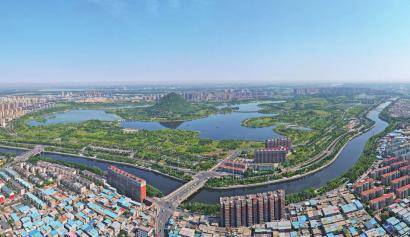 6月14日,盛夏时节的济南华山历史文化湿地公园满目葱绿,湖面清澈如镜,公园南侧小清河静静流淌,华山就如同一颗翠玉镶嵌在水面上,在蓝天映衬下,山、泉、湖、河、城交相辉映,令人心旷神怡。