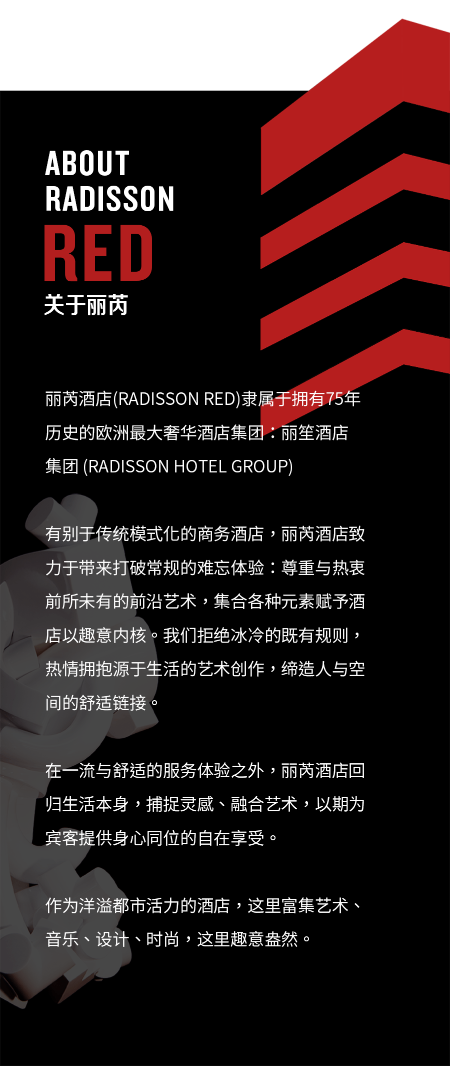 “丽芮酒店(中国)Radisson RED(China)”于2020年初正式进入中国市场。丽芮酒店以红色为灵感,秉承“趣意生活无边界 ENJOY IT!”的品牌理念、通过打破常规且新颖的设计、体现其大胆无畏和风趣诙谐的丽芮态度。在为客人打造难忘居住体验的同时,通过绑定大IP、打造有内容的高频消费场景,丽芮酒店也为投资者带来意想不到的收益空间。