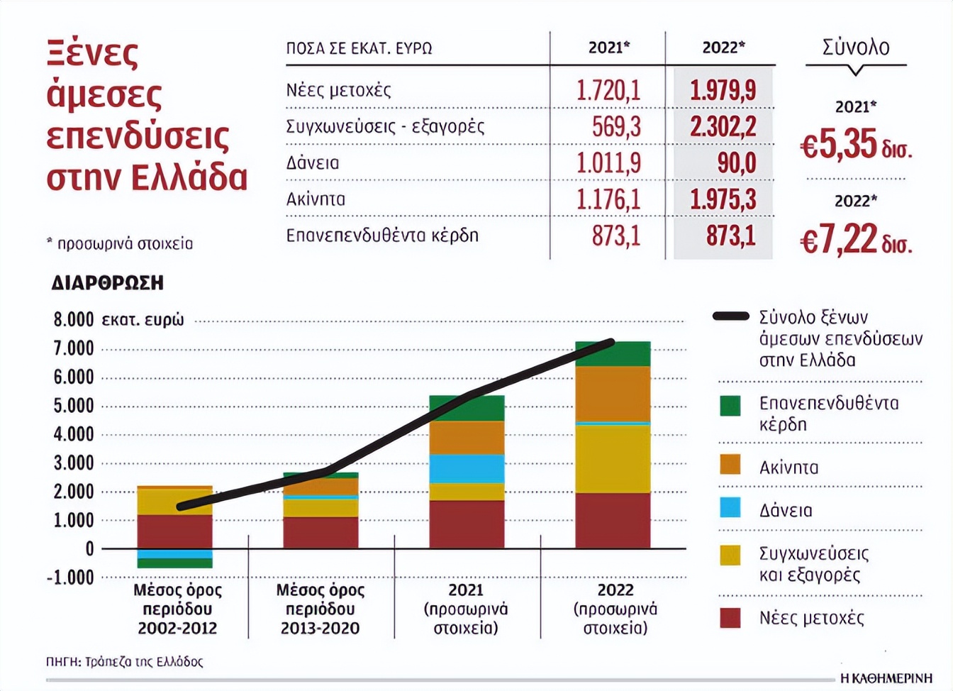 与此同时,有数据显示,2022年希腊的外国直接投资(FDI)创下20年新高,达到72.2亿欧元。投资主要来自现有企业的收购或私有化以及房地产投资。