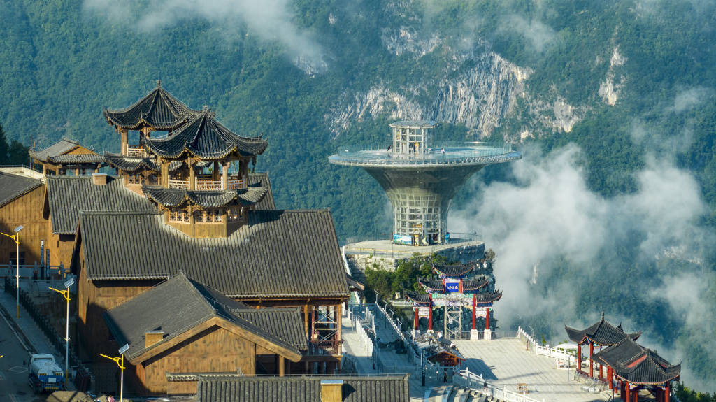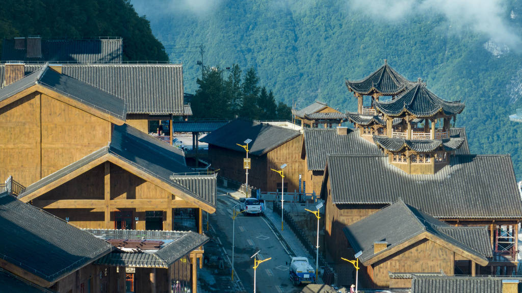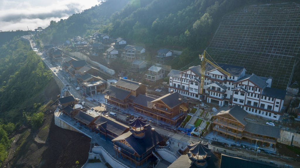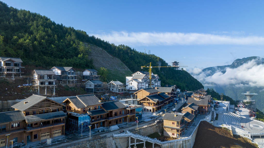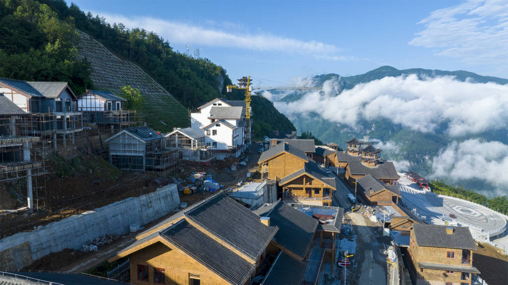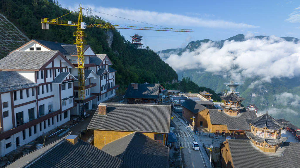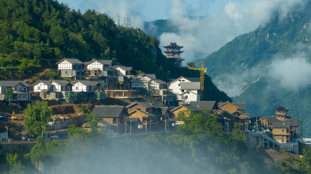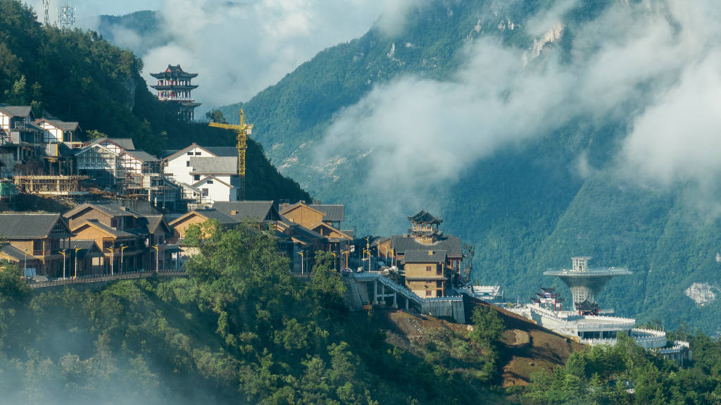 6月13日,雨后的巫峡口景区“天街”工程现场正在紧张施工中。