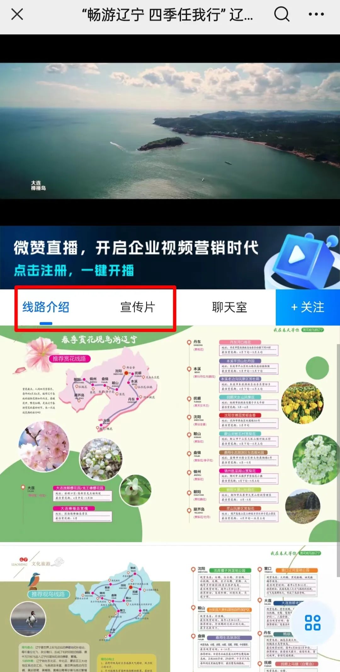 除直播内容,直播间菜单栏还贴心附上了辽宁旅游宣传片和省内赏花、观鸟两条特色旅游路线攻略图,可以说是为吸引游客的到来做足了准备,本场直播目前已吸引358.1万的观看。