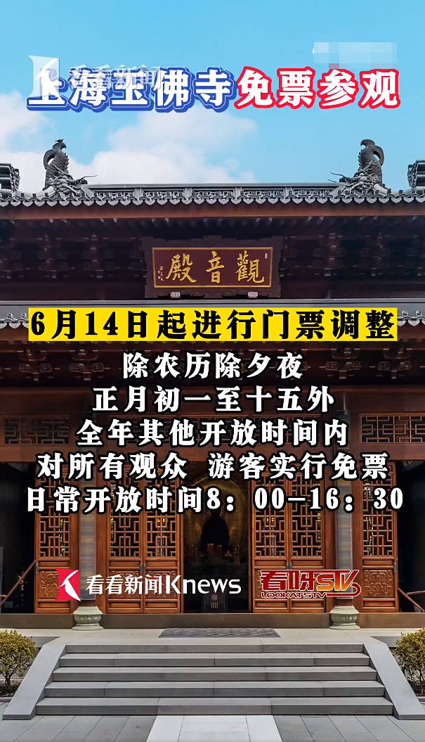 6月14日,上海玉佛禅寺通过其微信公众号发布通告称,自即日起,上海玉佛禅寺除农历除夕夜、正月初一至十五外,全年其他开放时间内对所有信众、游客实行免香花券入寺。记者了解到,此前上海玉佛禅寺平日香花券为每人20元。