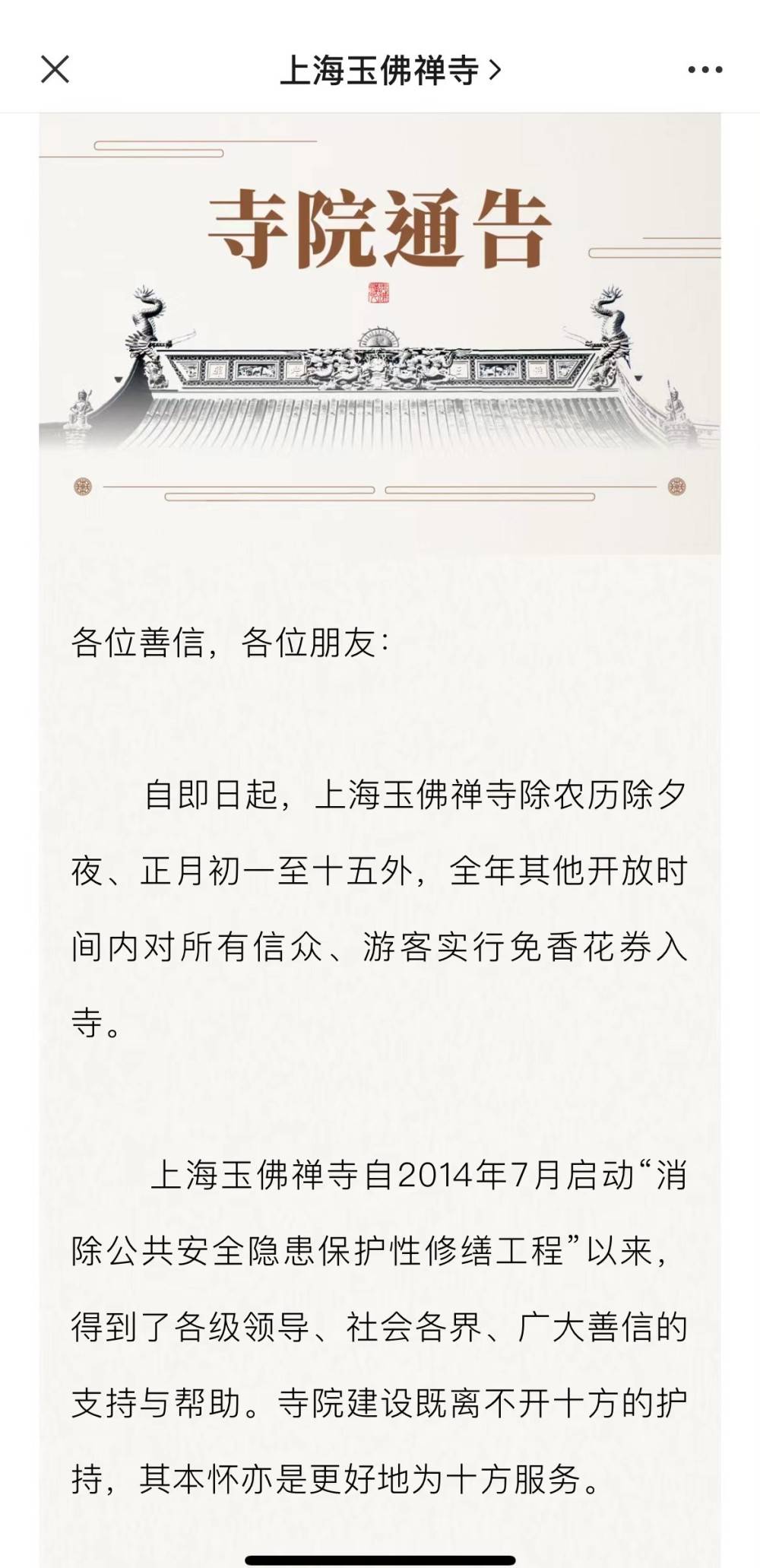 即日起,除了农历除夕夜及正月初一至十五外,上海玉佛禅寺将在全年其它时间“免门票”入寺。图为:“上海玉佛禅寺”微信公众号截图。(文/澎湃新闻)
