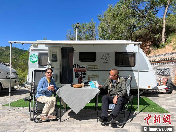查海勇和妻子在挂式房车前看书喝茶。 于晶 摄