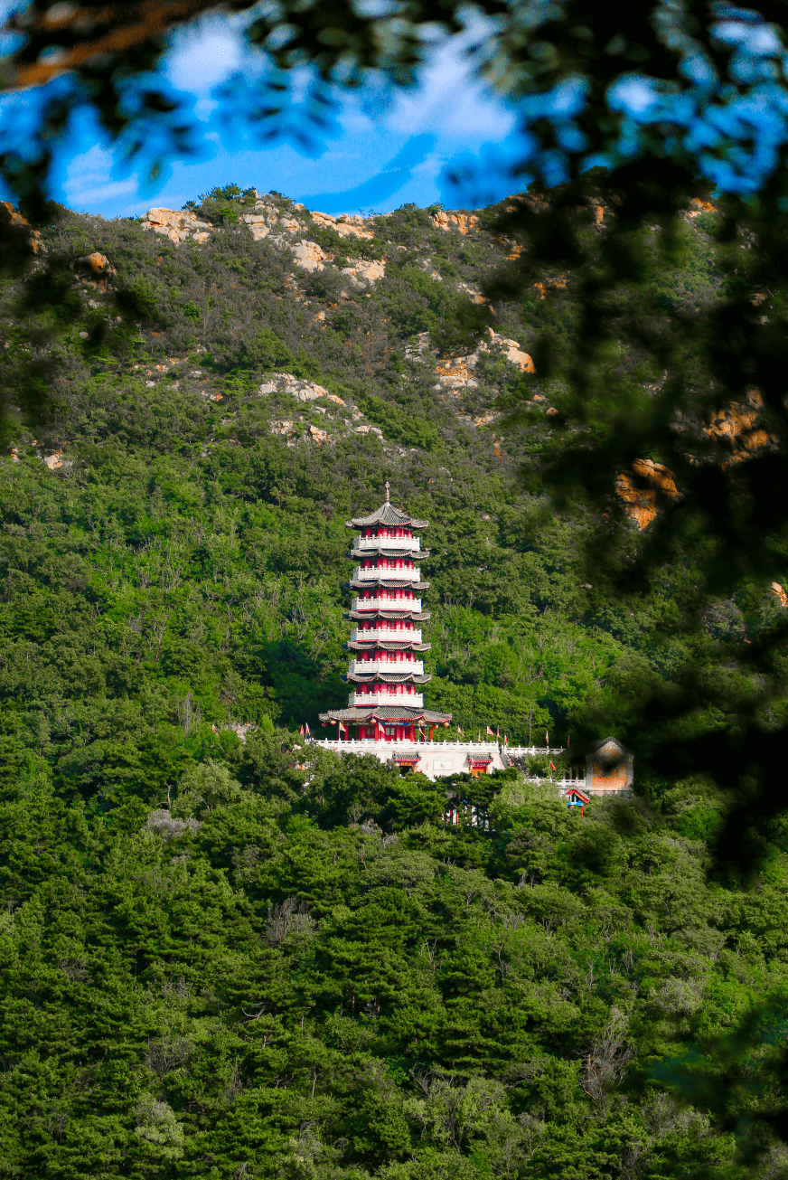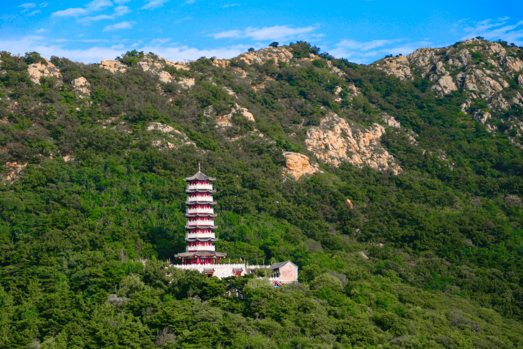 莱州大基山景区,群峰环抱,中为幽谷,谷内松柏苍郁,枫槐葱郁,间以桃红李白,构成了流芳溢翠的林海景观。