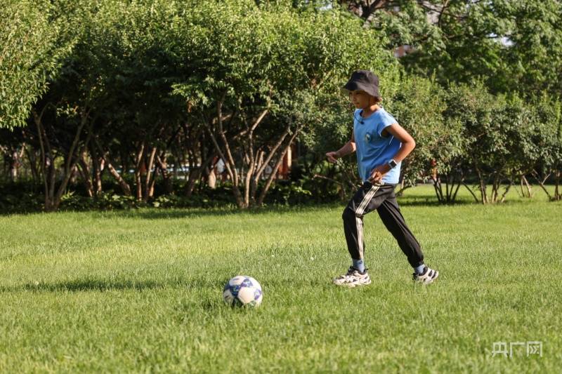 小朋友在石家庄市石津灌渠文化公园绿地上踢足球(央广网记者 王伟倩 摄)