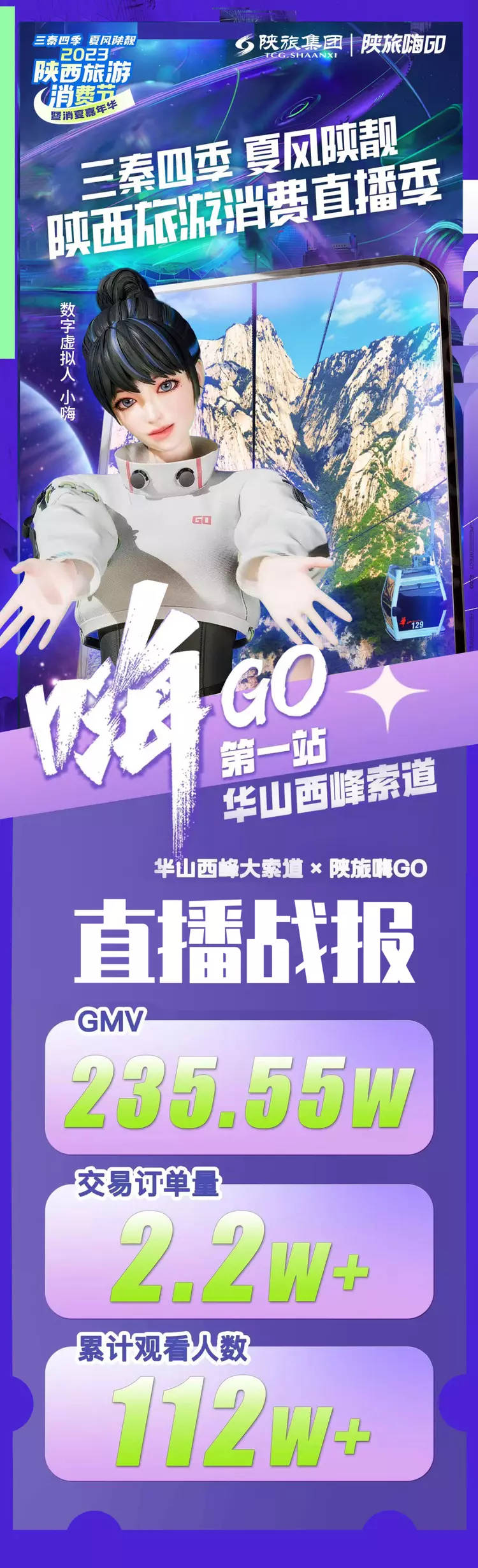 启动当天,本届消费节线上活动“陕西旅游直播季”首场华山西峰索道专场在“陕旅嗨GO”直播间开播,创造总GMV235.55万,订单量2.2万+,观看人次达112万+,以优异成绩拉开了直播季序幕,也刷新直播间抖音本地生活服务商西北五省单店直播记录。