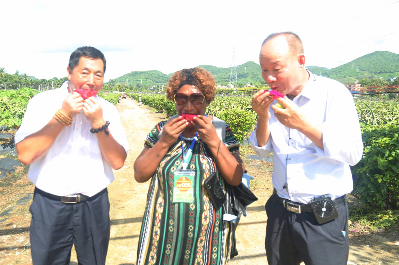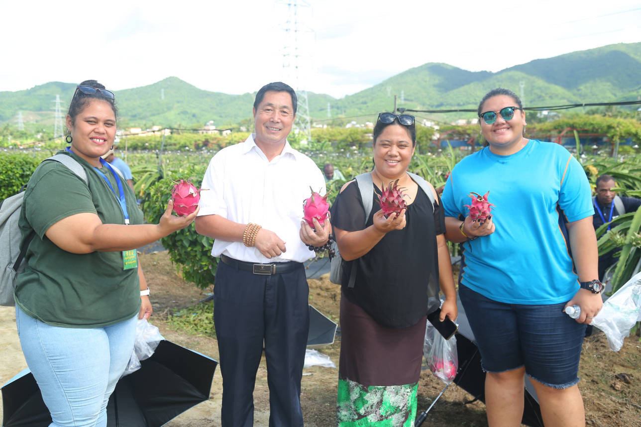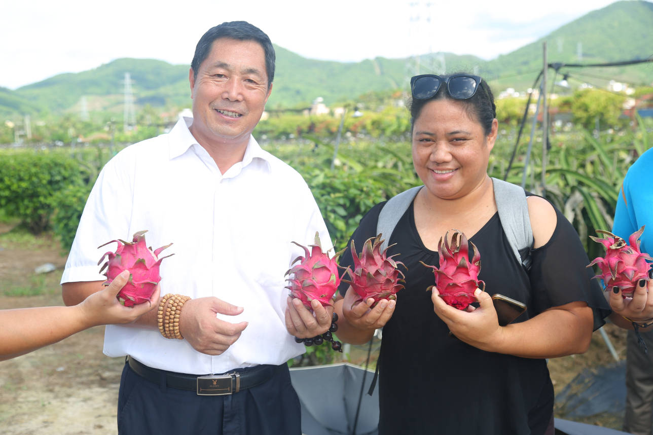 国际友人走进红花共享农庄的火龙果基地、百香果基地,调研、考察、采摘交流,开心交谈,不亦乐乎。
