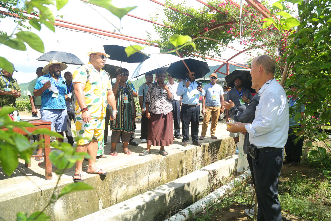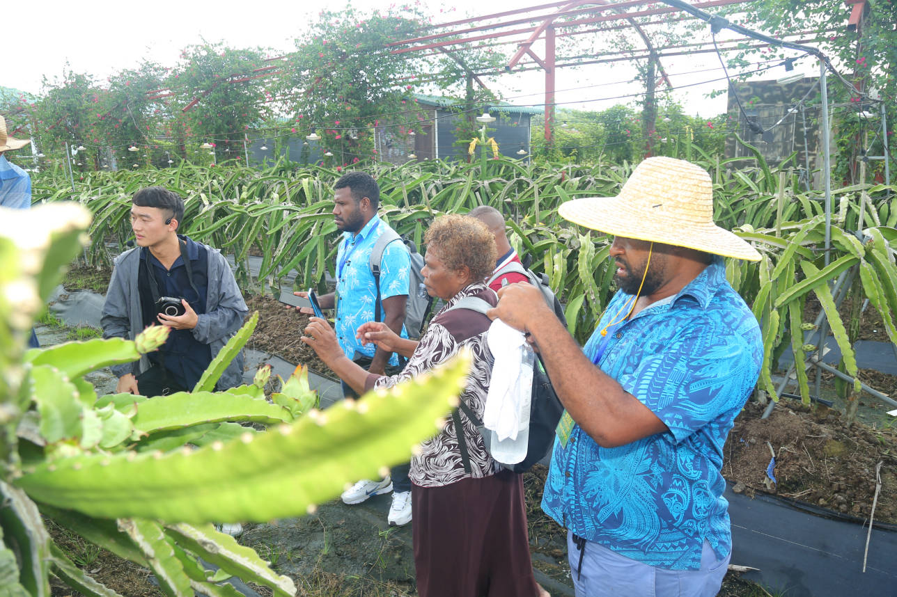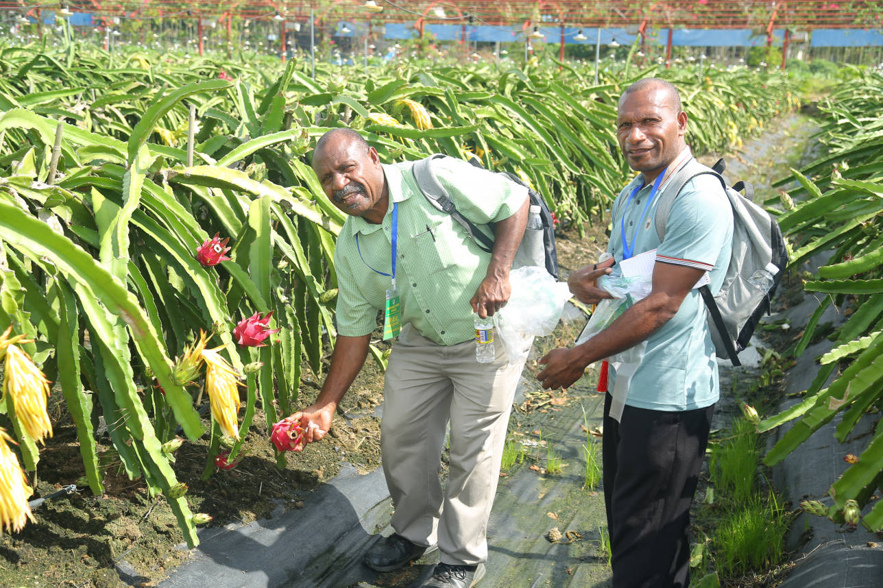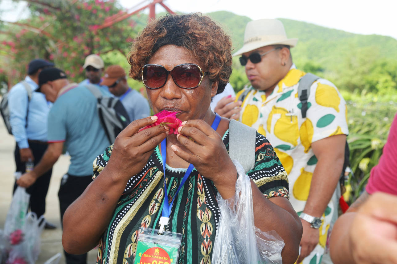 国际友人走进红花共享农庄的火龙果基地、百香果基地,调研、考察、采摘交流,开心交谈,不亦乐乎。