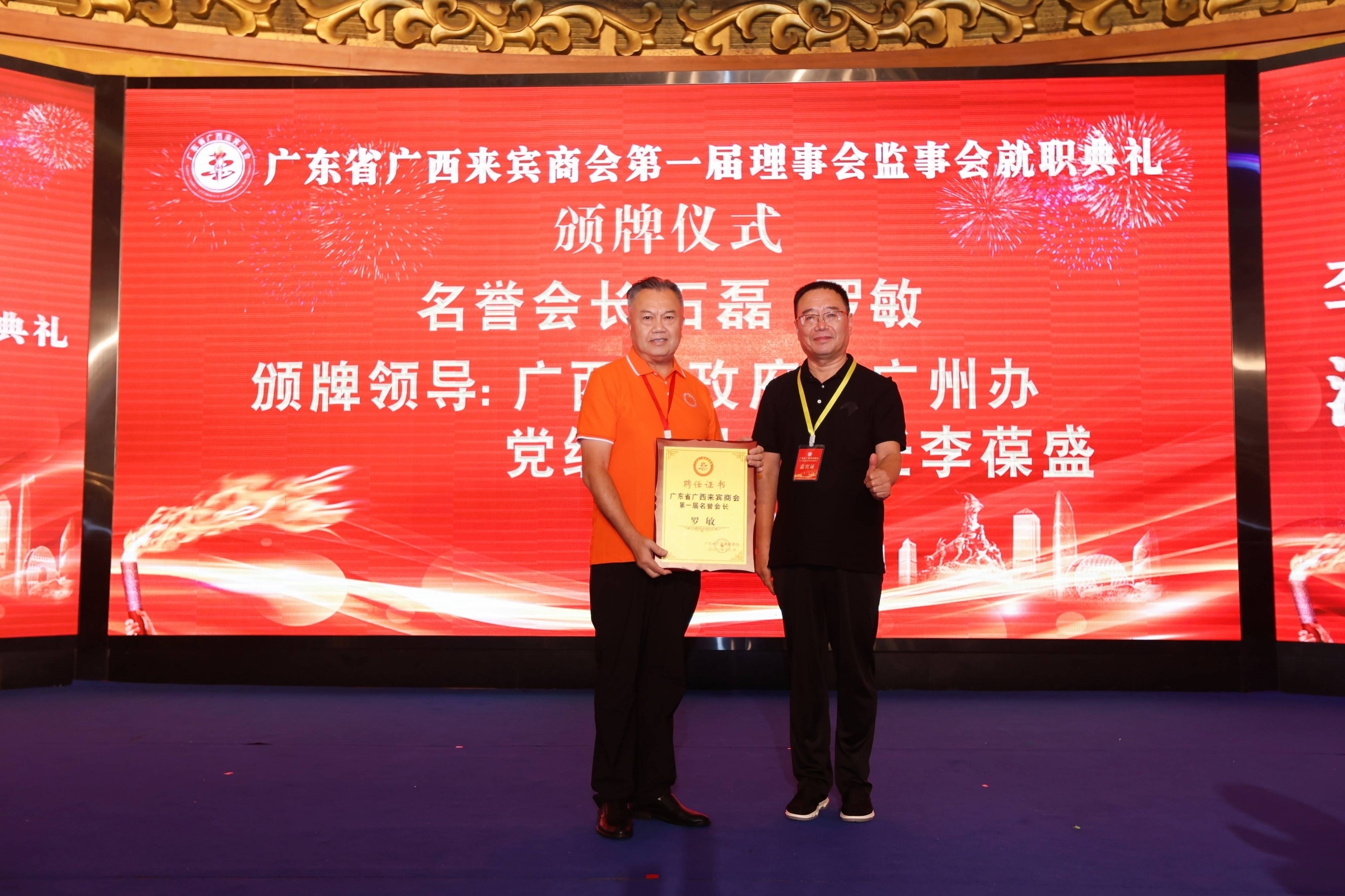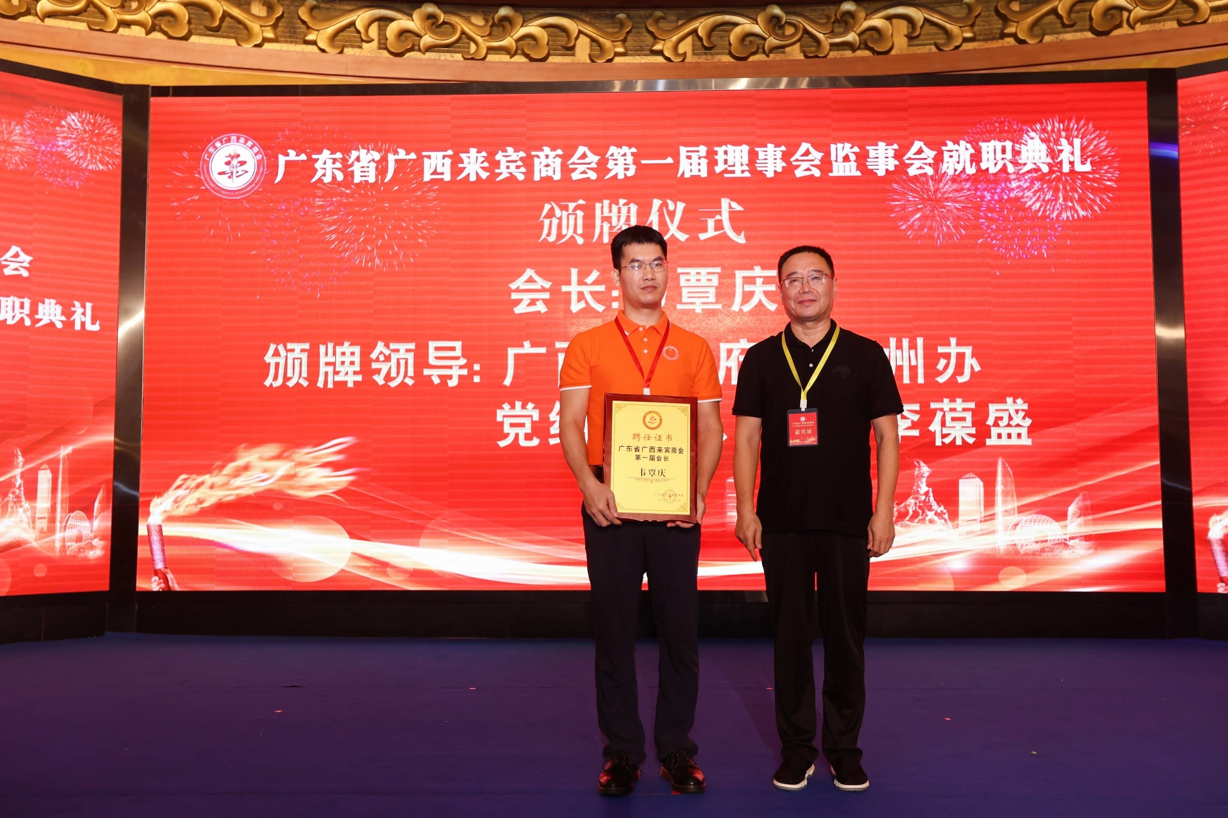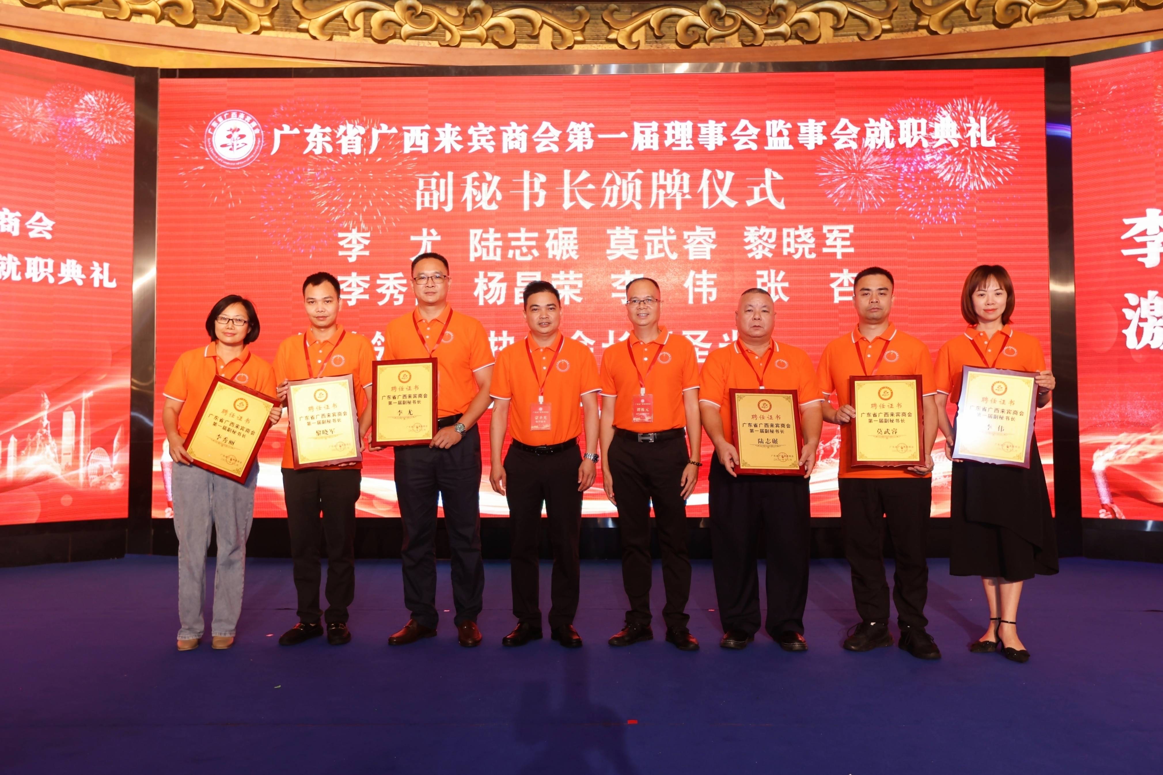 2023年6月17日,对于广东省广西来宾商会来说,是一个值得纪念的日子。广东省广西来宾商会第一届理事会监事会就职典礼在广州举行。广西区政府驻广州办党组书记、主任李葆盛,来宾市政府副市长邓应文、来宾市政协副主席黄锡萍、深圳市工商联专职副主席覃敬腾,广东省广西商会执行会长韦振杰、广东省广西商会演艺设备专委会会长戴小明、广东省广西玉林商会会长林汉、广州市广西商会执行会长莫兰贵、中山市广西商会执行会长陈必松、广州广西桂平商会会长黄良柱、东莞市广西来宾商会会长韦丁义、柳州市来宾商会会长江晴、南宁市武宣商会会长潘传兴,广东省广西来宾商会名誉会长罗敏、会长韦覃庆、执行会长蒙圣光、执行会长兼秘书长谭栋元等领导嘉宾和各商协会代表近300人参加。