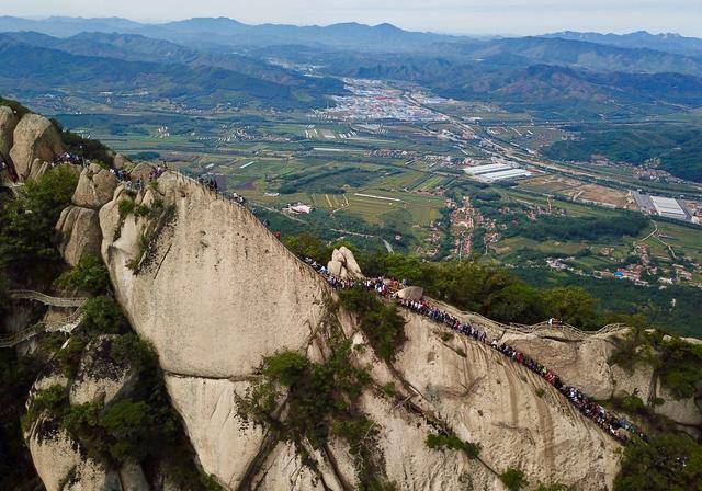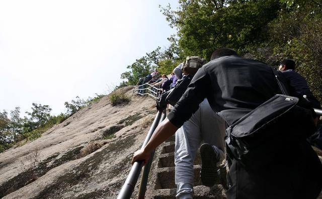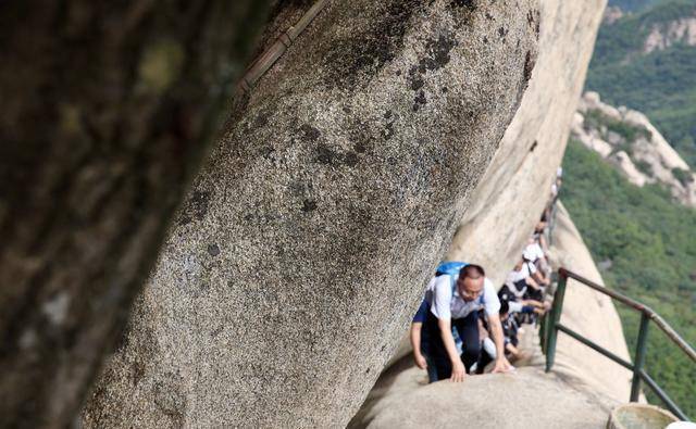 可以这么说老牛背的奇险状况,绝不输给华山的苍龙岭,甚至给人的印象更为深刻。远远看去,一群人就这么依靠着手拉栏杆一路向前,也是一条壮观的景色。