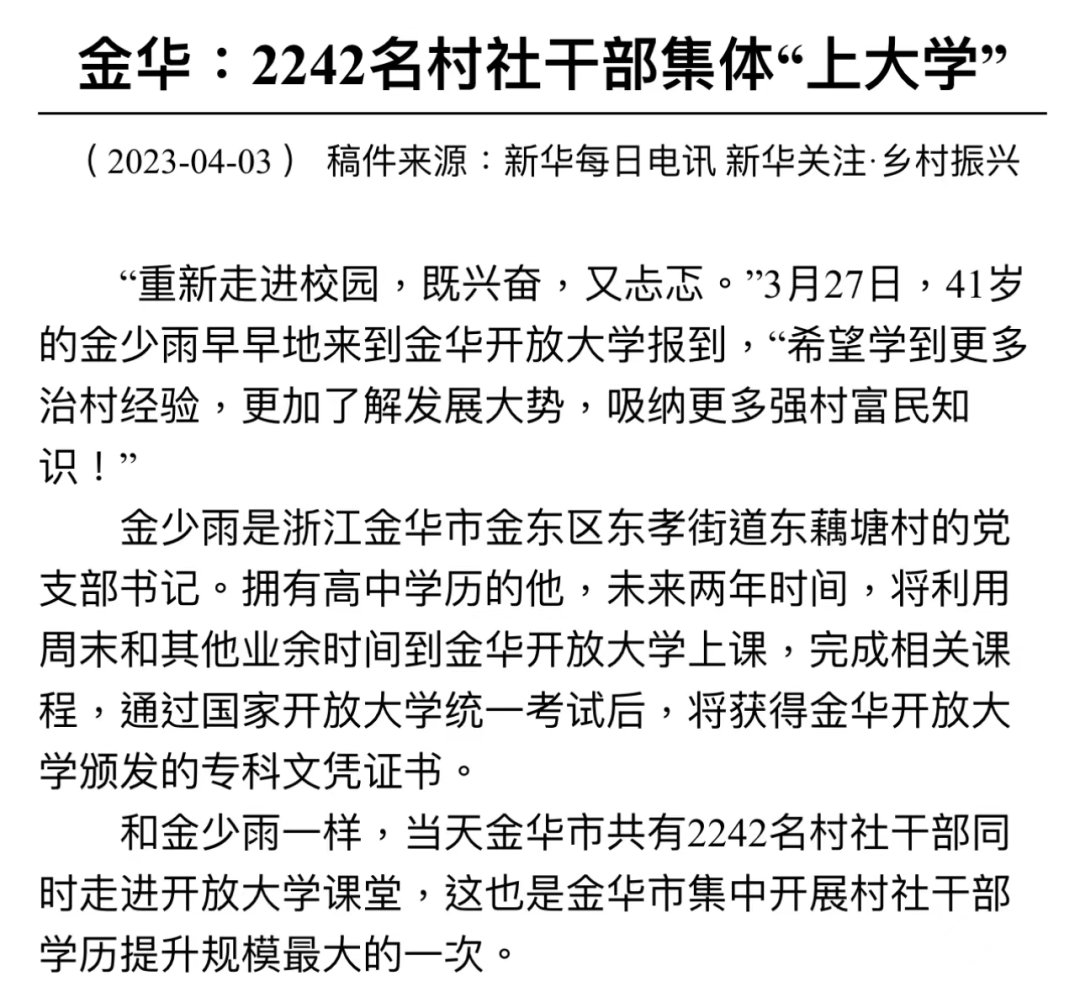 4月3日,新华每日电讯刊发《金华:2242名村社干部集体“上大学” 》,聚焦金华集中开展村社干部学历提升,多措并举提升村社干部的能力。