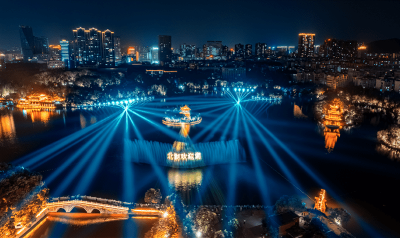 夜间的北湖公园则是另一番景色——光影空间水秀“北湖水月”正在上演,这是目前最前沿、最科技、最综合的中大型声光电+微演艺于一体的灯光表演。它充分挖掘了郴州的文化特色与青绿山水形态之美,体现了对郴州发展的美好展望。