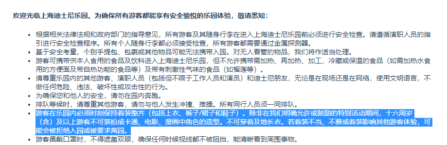据上海迪士尼度假区官网,游客在乐园内必须时刻保持着装整齐(包括上衣、裤子/裙子和鞋子)。除非在上海迪士尼度假区明确允许或鼓励的特别活动期间,十六周岁(含)及以上游客不可装扮成卡通、电影、漫画中角色的造型。不可穿着及地长衣。若着装不当、不雅或着装影响其他游客体验,可能会被拒绝入园或被要求离园。