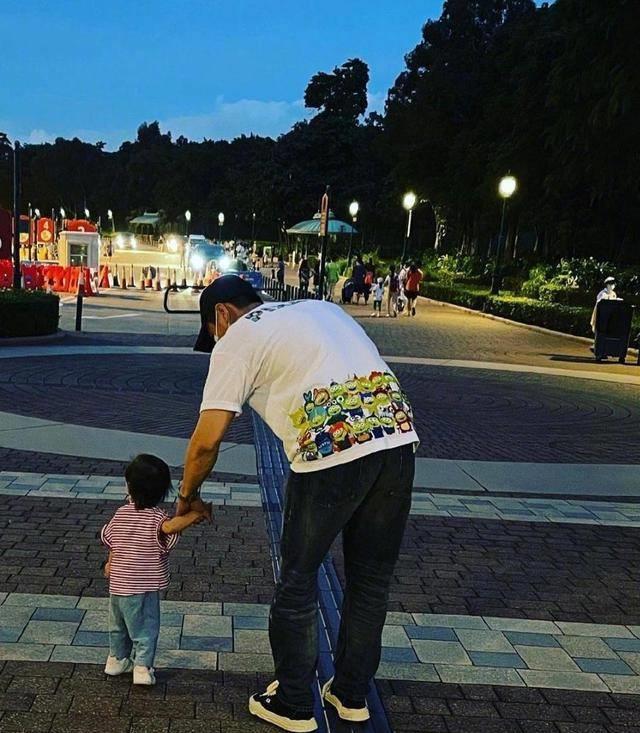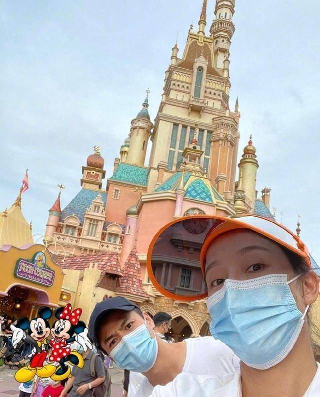 一家人在迪士尼城堡前合影,杨怡素颜戴口罩遮面,戴着帽子防晒措施到位。罗仲谦歪着头神态俏皮,依然像个大男孩儿。