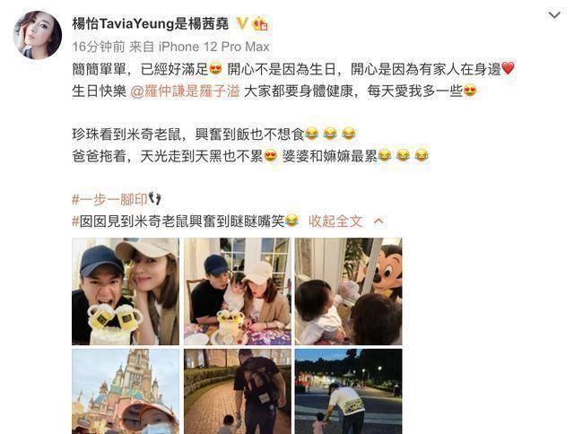 一家人来到迪士尼庆祝生日,杨怡称珍珠看到米老鼠之后,连饭都不想吃了,从白天走到黑夜都不觉得累。