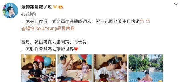随后罗仲谦也发文,祝自己和老婆生日快乐,分享了写在迪士尼非常温情的照片,并表白女儿:爸妈带你去游乐园玩,长大后,就到你带爸妈去环游世界。