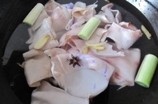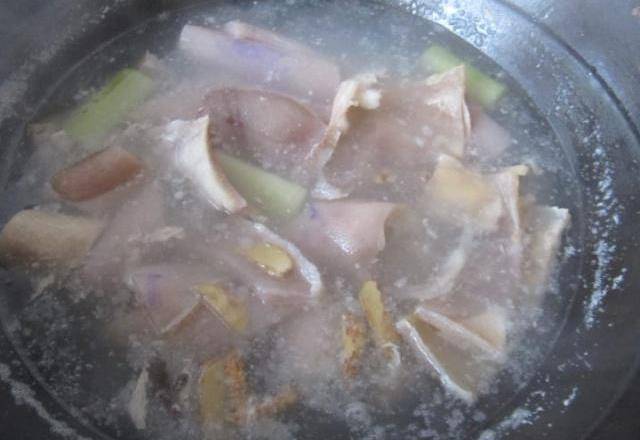 在焯水过程中要不断的将浮沬撇出,开锅焯水8分钟关火,捞出猪皮备用。