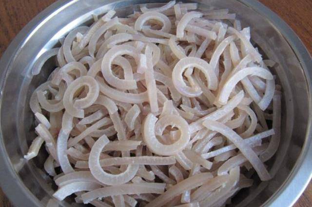 将处理好的猪皮切成二寸长的段,再改刀切成细丝备用。