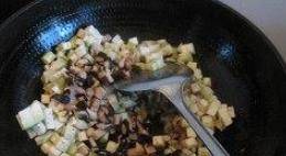第6步,把肉丁放入煸炒,加入适量的料酒,少量老抽煸炒,等肉丁颜色发生改变时倒入茄丁,香菇丁翻炒。