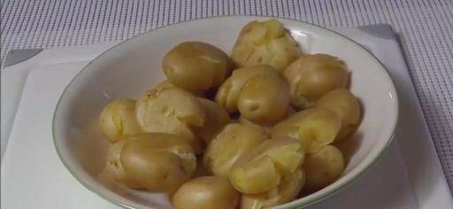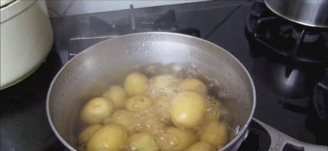 小土豆清洗干净后,用手搓去外翻的表皮,然后再放在小锅里加水煮熟,在中火的情况下大约煮7-8分钟。只要用筷子轻轻地扎一下,表面变得软软的即可,然后随即捞出控净水分备用。因为小土豆含有淀粉,所以捞出之后,可以过一下凉水。