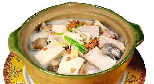3. 准备一大型砂锅,将豆腐、蹄筋、海参、鱿鱼、笋、猪肚、洋菇放入锅中,加高汤、盐、味精,先用大火煮滚,再改小火炖煮,约1小时即可,食时整锅上桌。