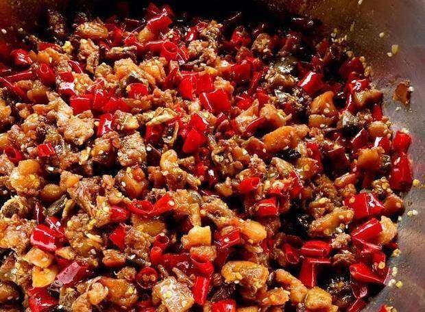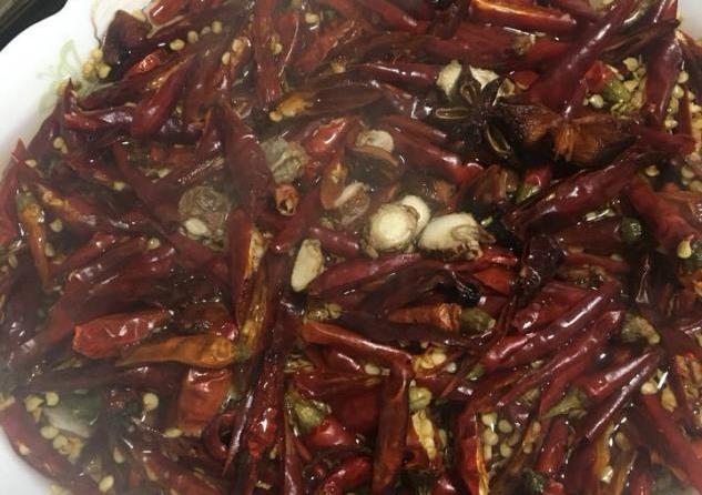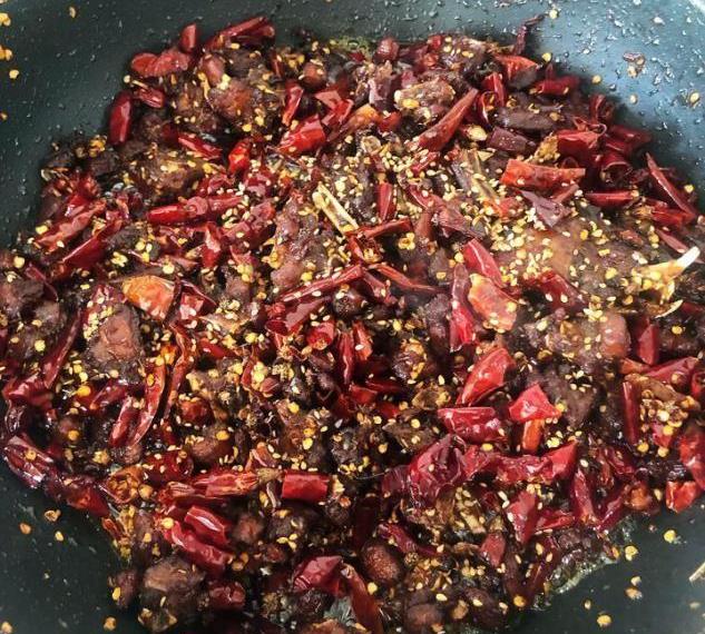 步骤六:下一步就往锅里加入之前剪好的干辣椒段,翻炒8分钟左右,锅里的水分就会逐渐的蒸发,此时我们将兔肉拨到锅的一边,然后往油锅中撒入准备好的青花椒和白芝麻,用热油滚出香味之后,再将锅里所有的食材都搅拌均匀。等可以闻到非常浓郁的香味时,就将火关掉。