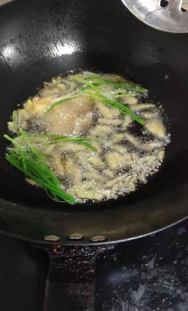 步骤四:接下来拿出锅,将锅预热一下之后往里面倒入适量的油,趁着冷油热锅的状态往里面加入葱,然后开小火熬出葱油,等葱被炸干了之后就将其捞出。