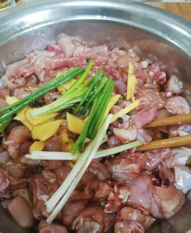 步骤三:准备好了之后,将之前处理好的兔肉放入一个合适大小的盆中,然后往里面加入盐,老抽,料酒,糖,姜片,蒜瓣,葱段,陈皮,八角,桂皮,香叶,山奈以及少许的玉米淀粉(之所以加入玉米淀粉,是避免兔肉在炒制的过程中里面的水分过度流失,加少量玉米淀粉可以让做好的兔肉肉质更加鲜嫩,口感更好)。加好了之后,用一个大勺子将兔肉和调味料充分搅拌均匀,然后将碗放在一旁腌制两个小时左右,这样做出来的兔肉就会更加的入味。