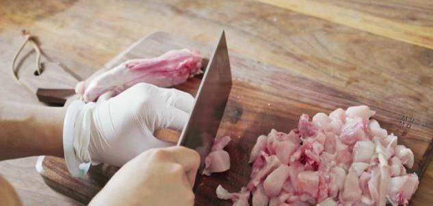 步骤一:在准备烹饪佳肴之前,我们要将所有需要用到的食材全部都准备好,这样在烹饪的时候就不会手忙脚乱了,更加得心应手。食材都准备好了之后,我们将兔肉放在案板上,用刀剁成两厘米左右的小方块(注意兔肉不要切得太小,因为在翻炒的时候会缩水,如果一开始就切的太小的话,那后面制作出来的成品都非常的小,口感就不足),然后再将兔肉放在清水下充分洗干其表面残留的血水,再沥干水分备用。