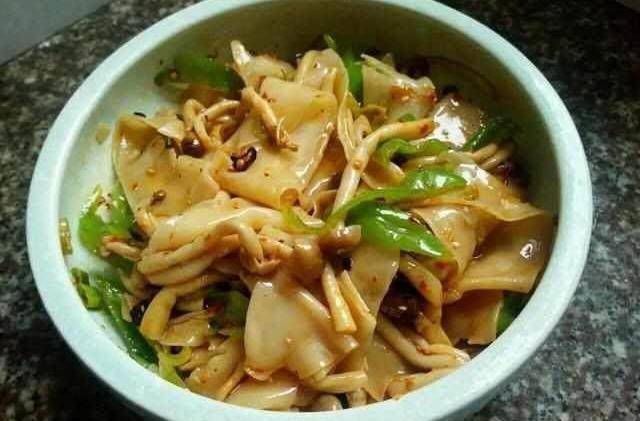 5、青椒切成细长条,菌菇开水煮熟后过凉水,一同放到饺子皮里,倒上2勺辣子,少量的白糖、醋、海鲜酱油调在一同做成料汁倒进去,起锅烧热油,放葱花炒成葱油趁热倒在面上即可。