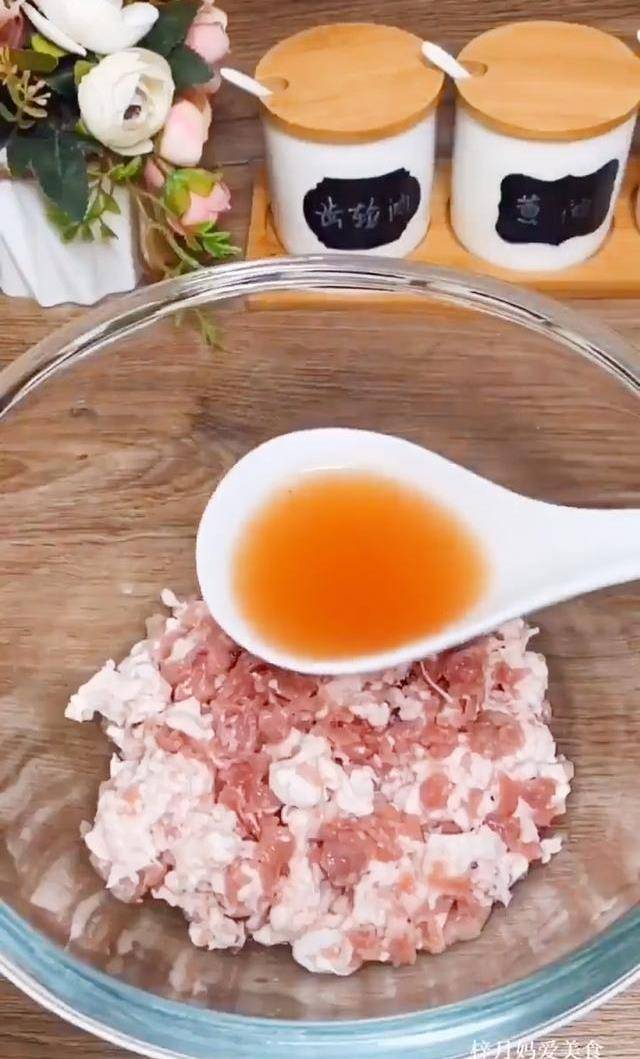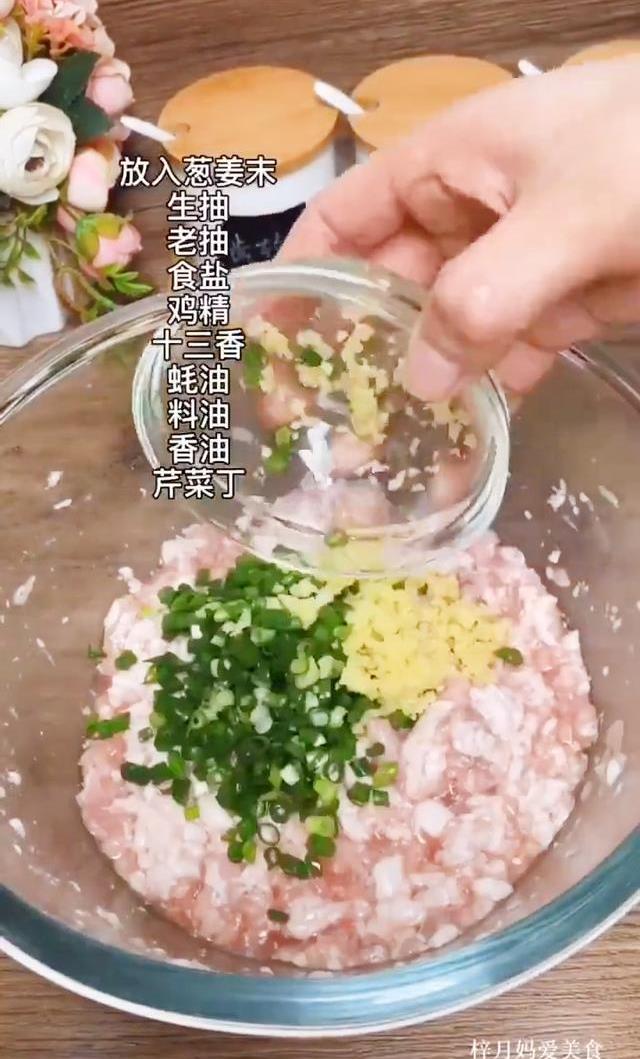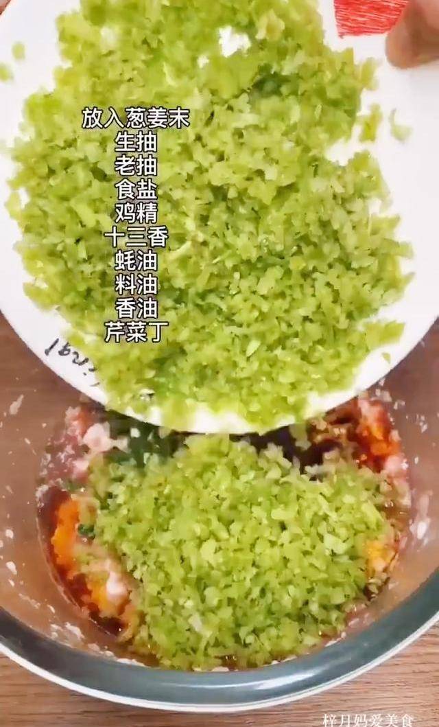 泡好的花椒水分3次放入肉馅中,顺着一个方向搅拌,上劲,搅拌成粘稠状。然后再放入葱,姜末,生抽,老抽,食盐,鸡精13香,蚝油,料油,香油。最后再放入芹菜丁,给它搅匀,这个馅就调好了。