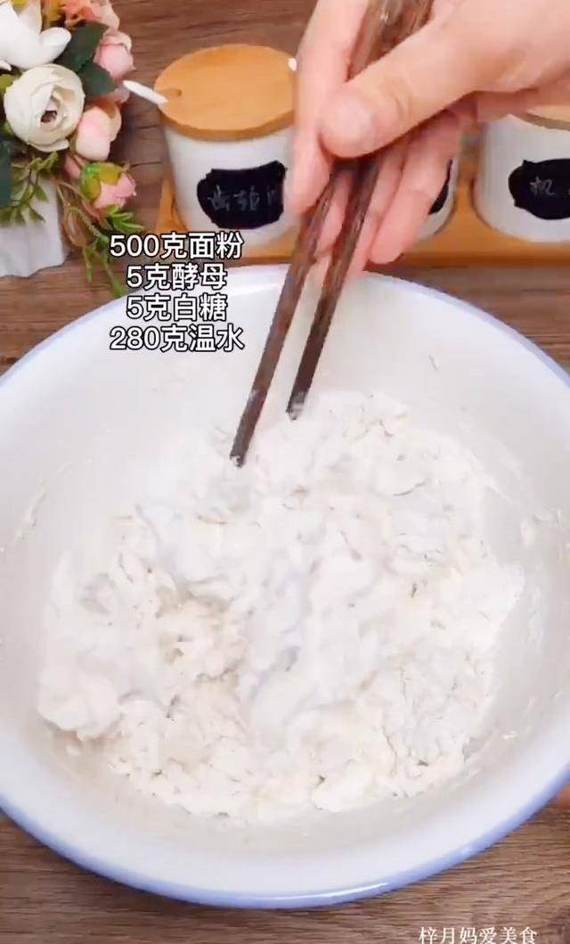 首先准备500克面粉中,然后加5克酵母粉,5克白糖。280克温水。先给它搅成面絮,再揉成一个光滑的面团,蜜蜂形状发两倍大。
