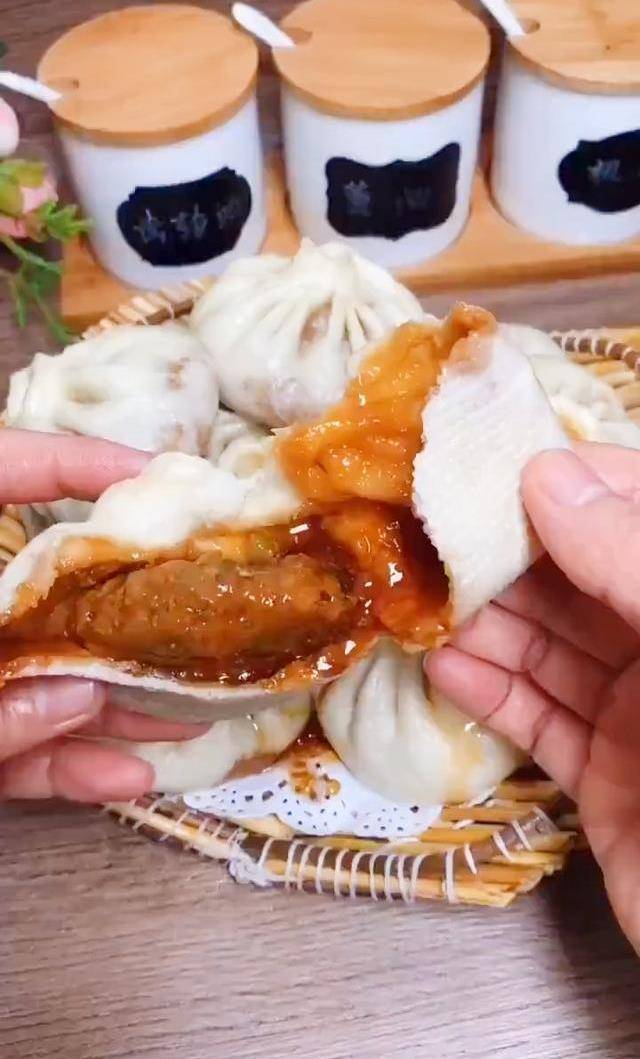 这样做的大包子你们想不想吃,芹菜,猪肉馅的皮包馅大。我们掰开一个,看一下里面满满的汤汁。特别的好吃,这个馅料你一定要试做一下哦,下面我就把教程发出来。