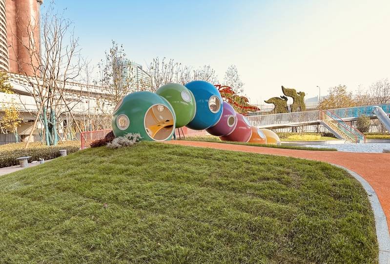 此外,高架桥柱彩绘、彩虹桥、七彩毛毛虫滑滑梯等设施大胆采用鲜艳的色彩,扮靓了灰色空间,对从北面华亭宾馆、徐家汇体育公园和从南面宜家商场过来的行人来说,很抓眼球。