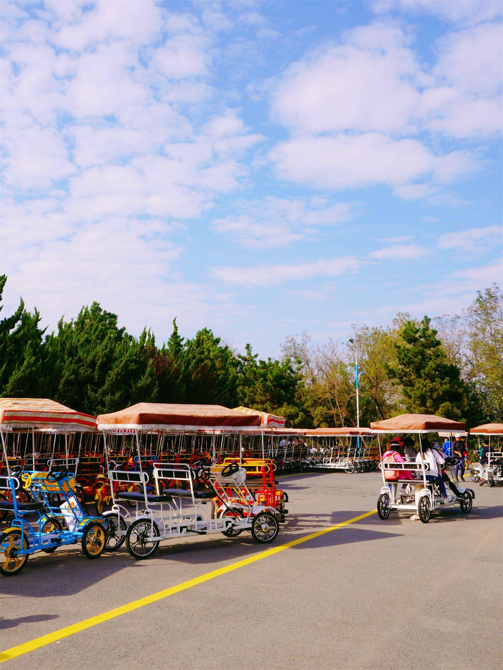 首先这里推荐大家从西门进入。直接进去,首先可以选择自己的游玩方式,门口有自行车、房车、电动车等车辆出租。如果你是孕妇或者小孩,我推荐房车。价格不贵,而且安全