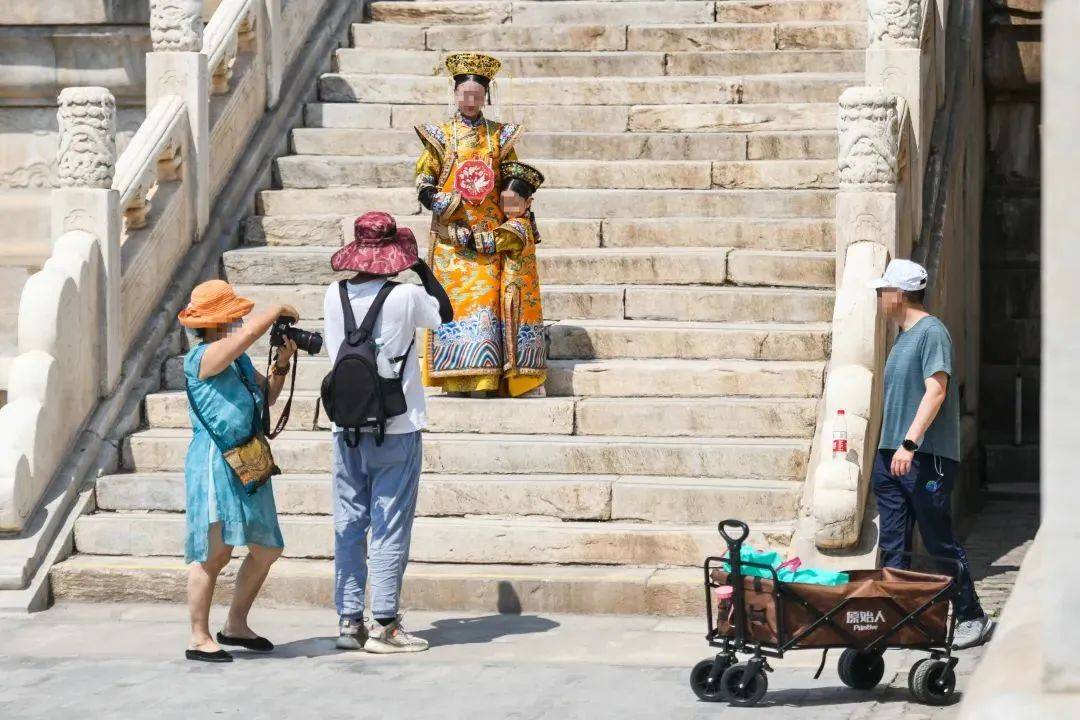 这位工作人员站在故宫体仁阁前接受采访,周围,六七位“皇后”正在被不同摄影师指导动作。“‘皇后’略抬头,别闭眼,这个角度能拍到最美的太和殿。”一位摄影师蹲在地上,耐心指导动作,并不时“劝阻”其他游客入镜,“那位美女,靠边点,谢谢。我就拍几张照片。”