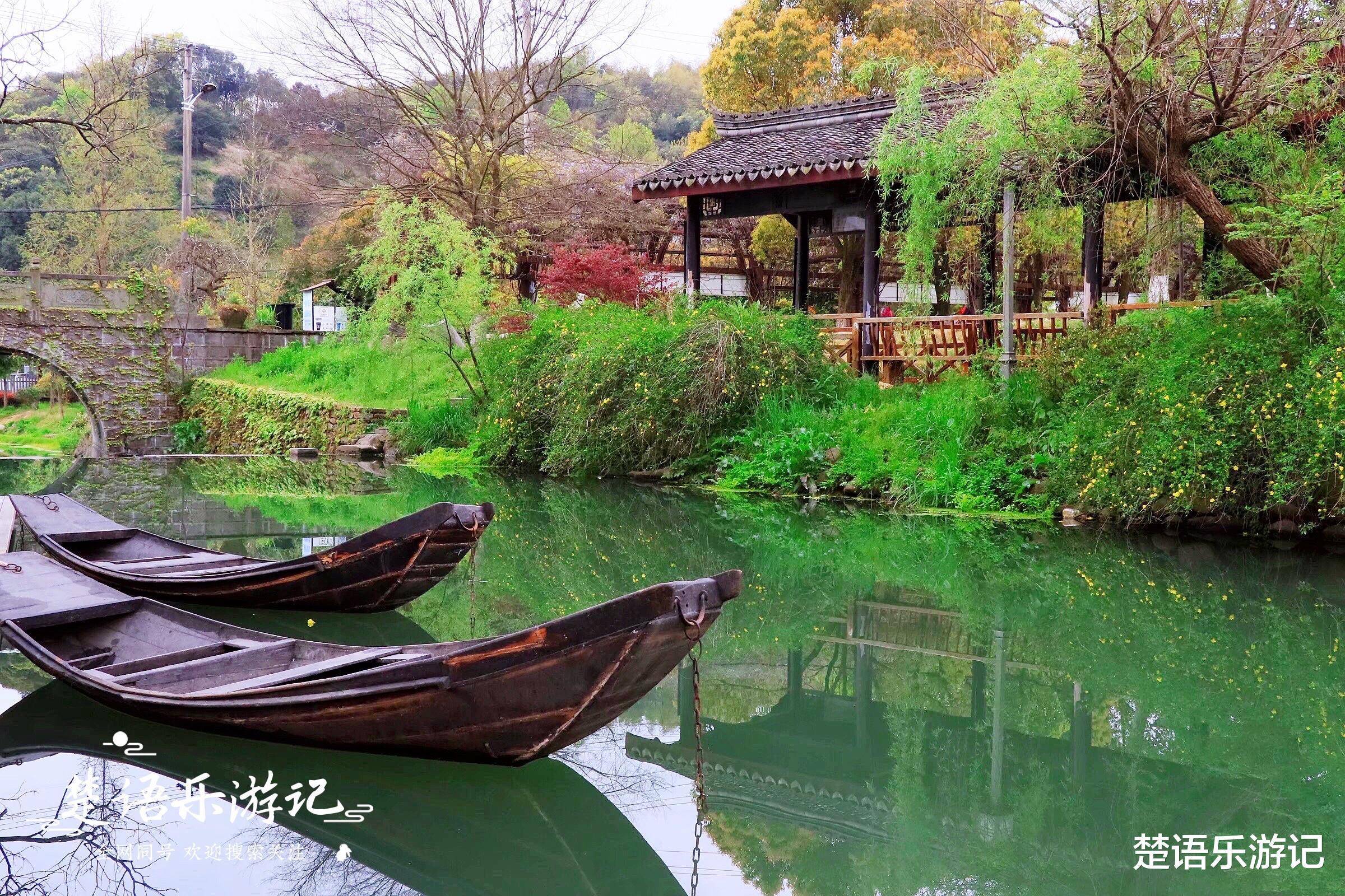 茅岙村最古老的景色是紫藤廊西侧的清溪和林地。现在这片森林已经变成了法治公园,但是风景却大不如前了,甚至显得有些压抑。公园旁边那条清澈的溪流依旧很美,溪水里还增加了两艘尖头船。平静的溪流水面,清晰地倒映着船只的倒影,宛如画在水面上。