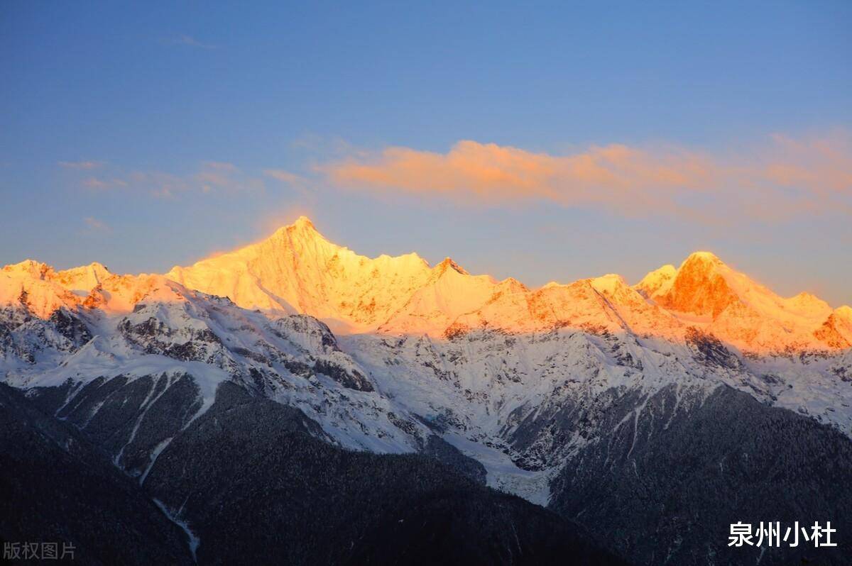 梅里雪山就像一座白色的金字塔,矗立在蓝天白云之间。晴空万里时,天空将雪峰映照得色彩斑斓。从山顶到山脚,景色各异。不同的风景构成美丽的风景。随着太阳慢慢升起,天空开始泛红,颜色从粉红色变成金红色。“金山日出”奇观完美呈现在世人面前。