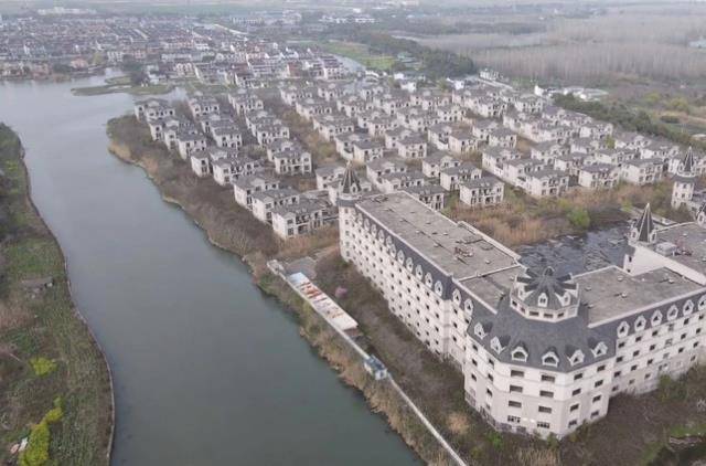 图中我们可以看到,除了数百栋别墅外,还有一座规模宏大的城堡式建筑。如果建成,将媲美上海的迪士尼。然而,在2012年左右,这个庞大的工程却因为开发商资金链断裂而意外烂尾,这个庞大的工程也成为一座坟墓般的“鬼城”。