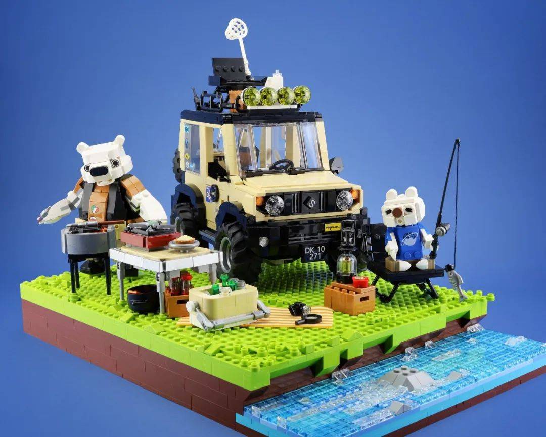 最适合野营的季节到啦!LEGO 7为我们带来了一个细节丰富的野营MOC,熊爸带着小熊开车来到河边,准备来一场快乐的夏季BBQ!熊爸准备了不少食材,小熊在河边垂钓,并且收获了一条小鱼。溪水清澈见底,透明的砖块作为小浪花让流水增添了动感。