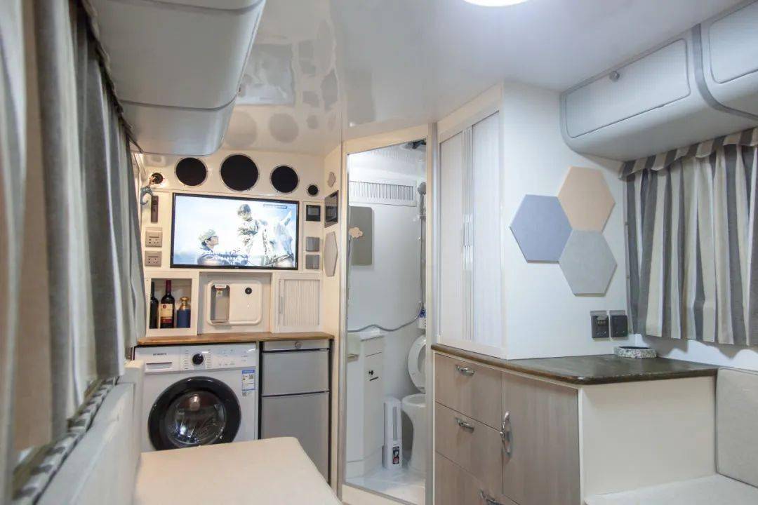 车内配备了32寸彩电,为旅行者提供了丰富的娱乐选择。同时,车内还配备了120L车载冰箱,6kg全自动滚筒洗衣机,壁挂饮水机等实用设施,让车友在车内能够享受到家一般的便捷生活。。