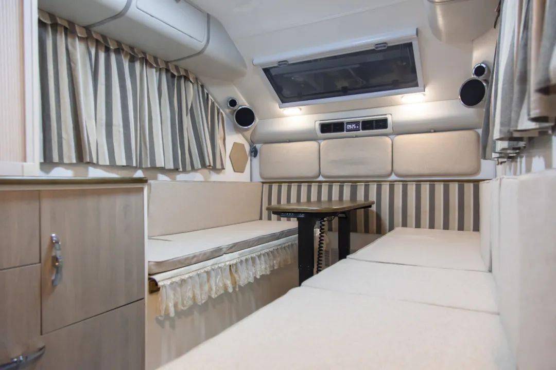 内部设计注重简约和实用,以米白浅色配色为主,加上顶部的灯光,让车友在车内能够感受到舒适温馨。车内的家具和装饰都采用了简洁的线条和颜色,让车内空间显得更加宽敞明亮。布局清晰,前方为会客区,后方为娱乐区域、卫生间区域,为车友提供了一个舒适便捷的居住空间。