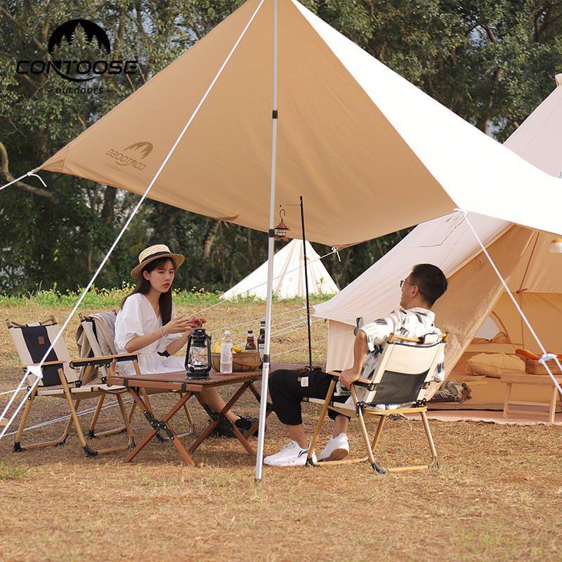 当前营地的顶篷非常新。它可以遮雨遮阳,在我们的营地搭建临时起居室。