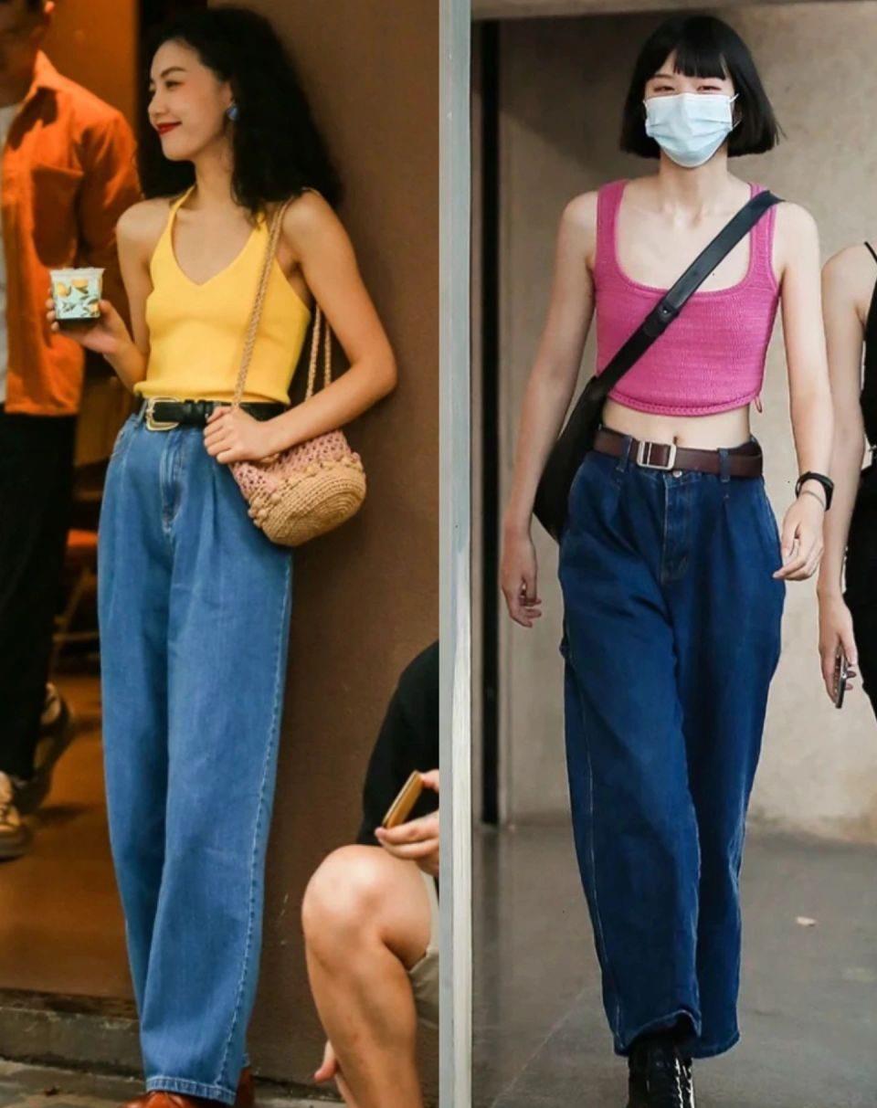 出现2。吊带+拖地牛仔裤