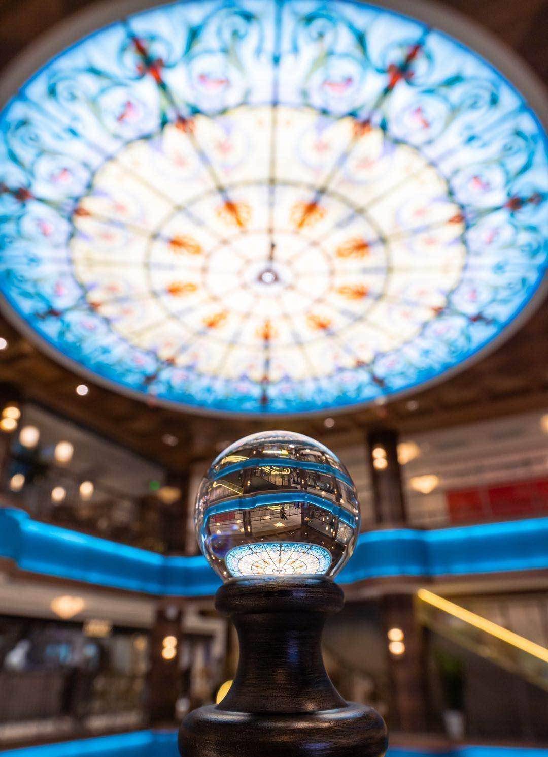 焕彩玻璃的穹顶,在art deco诞生之初的新材料,那是对百年建筑史的追忆与尊重……罗小姐穿着一身汉服,陈小姐则是旗袍装扮,两人结伴互相拍照,把豫园百货里里外外拍了个遍。