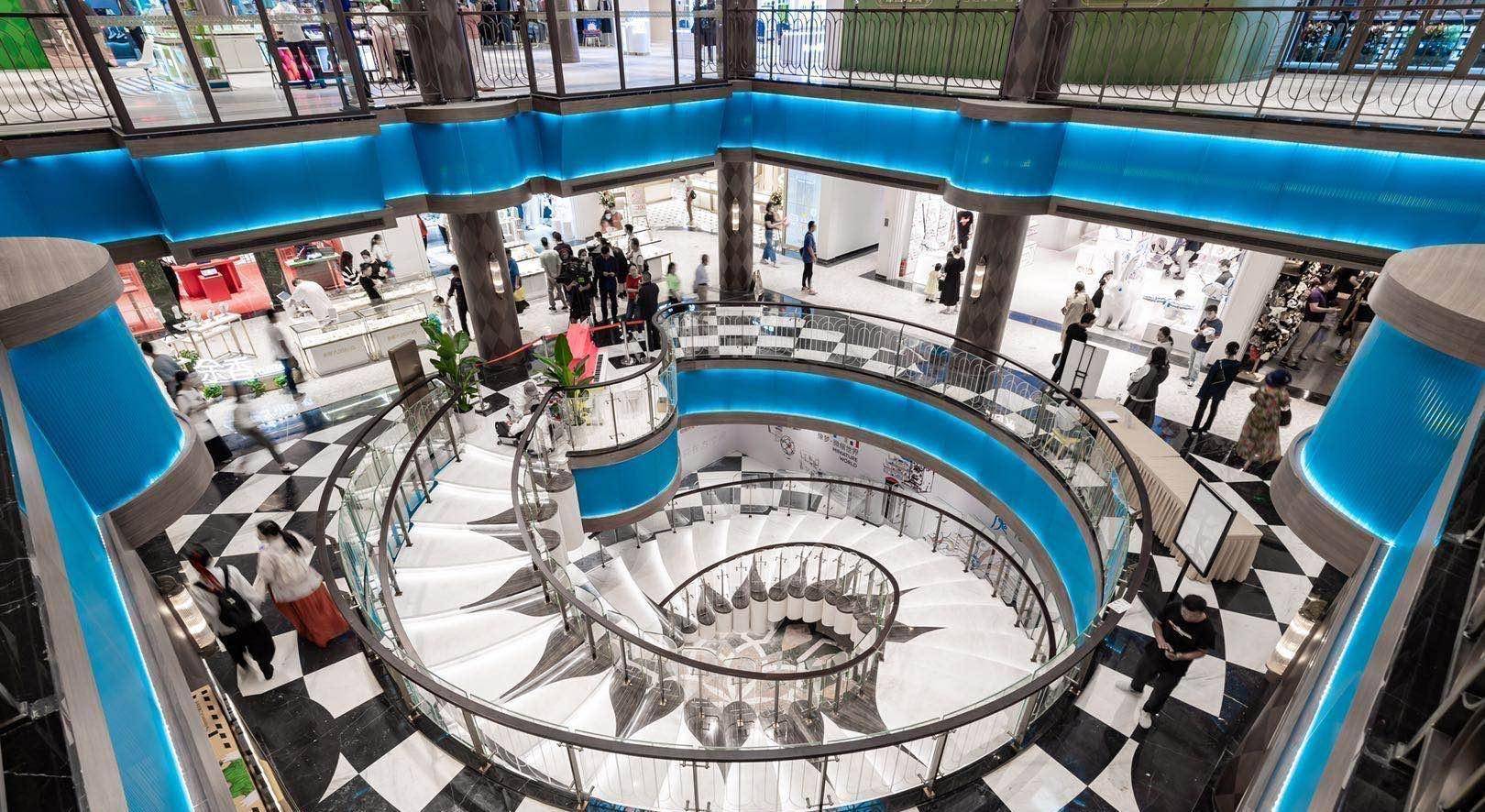 走入“豫园百货”,art deco代表的直线、对称和几何图形设计元素随处可见:水磨石、马赛克排列叠加成具有流线感的沉浸式走道、几何型的块面图案具有浓郁的复古式时尚;